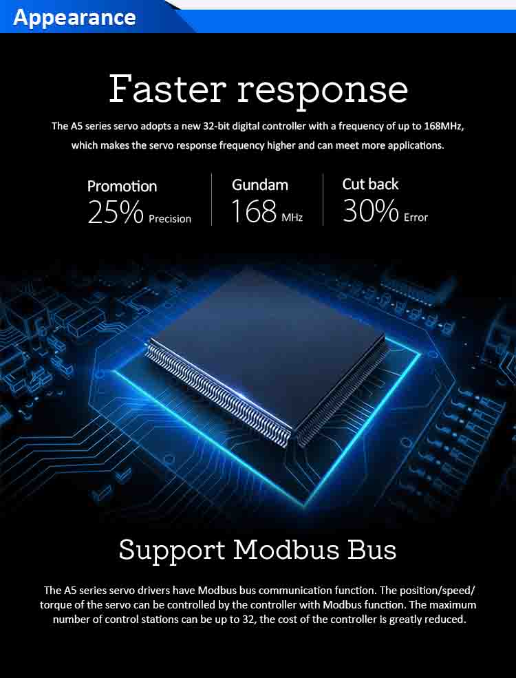 2.Mendukung 7 mode kontrol: posisi, kecepatan, torsi, posisi/torsi, posisi/kecepatan, kecepatan/torsi, dan posisi/kecepatan/torsi.